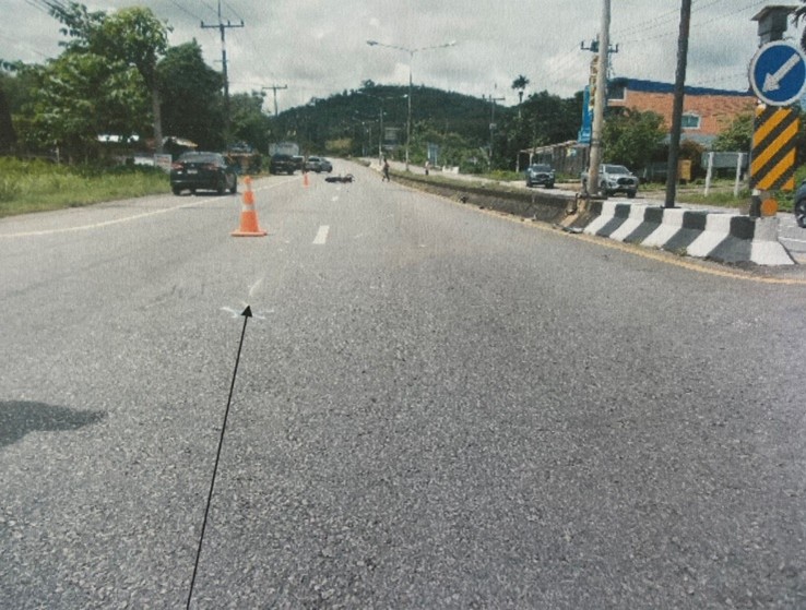 พ.ต.ท.นิติคม ขุนรอง สว.(สอบสวน) แจ้งว่าวันนี้(๕พ.ย.๖๗) เวลาประมาณ ๑๑.๑๐ น. ได้รับแจ้งเหตุรถเฉี่ยวชน จึงได้เดินทางไปตรวจสอบถึงที่เกิดเหตุ เป็นถนนสาธารณะเพชรเกษม ถนนมีเกาะกลางรถวิ่งทางเดียว ฝั่งละ๒ ช่องจราจร จุดเกิดเหตุเป็นถนนมุ่งหน้าไปตรังอยู่บริเวณช่องกลับรถ พบพยานหลักฐานดังนี้